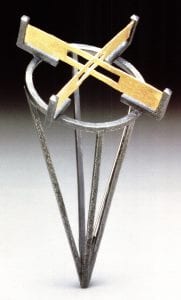 Given Wood's propensity for construction, it is unsurprising that he followed the austere and abstract Drawing Series with a return to the solidity of three-dimensional composition. The sterling and gold pieces of the Moment Series, 1990, demonstrate a continuing geometric concern, but one that involves the intersection of one-, two-, and three-dimensional space. Each silver cone defines volume on its open end and a single point at its tip. The gold crosspieces, rendered as if they were two-dimensional, vary in the placement of their central cutouts to define a point at the mouth of the vortex.
