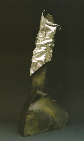 With more scoring on the acrylic than before, Just the Two of Us (all new works are 2007) better integrates the silver and plastic. Dealing with basalt this time, the ubiquitous volcanic, igneous rock throughout the Pacific Northwest and Alaska, Marshall returns to the birth of time as a theme. However, despite the better melding of stone and silver, the frequent division between upright silver and downward rocky base lends a tiring familiarity to pieces like Above the Clouds, Sleeping Together, and Horizon, the latter a revisiting of Serpent's lateral crawl over a supporting base. Landscape is more evident in Above the Clouds, with its silver "cloud" and chipped, two-part rocky "mountain range" below. The stone peak of Summit is wrapped in a sheet of silver that unfortunately suggests a metallic foil condom adorning a phallic shaft.