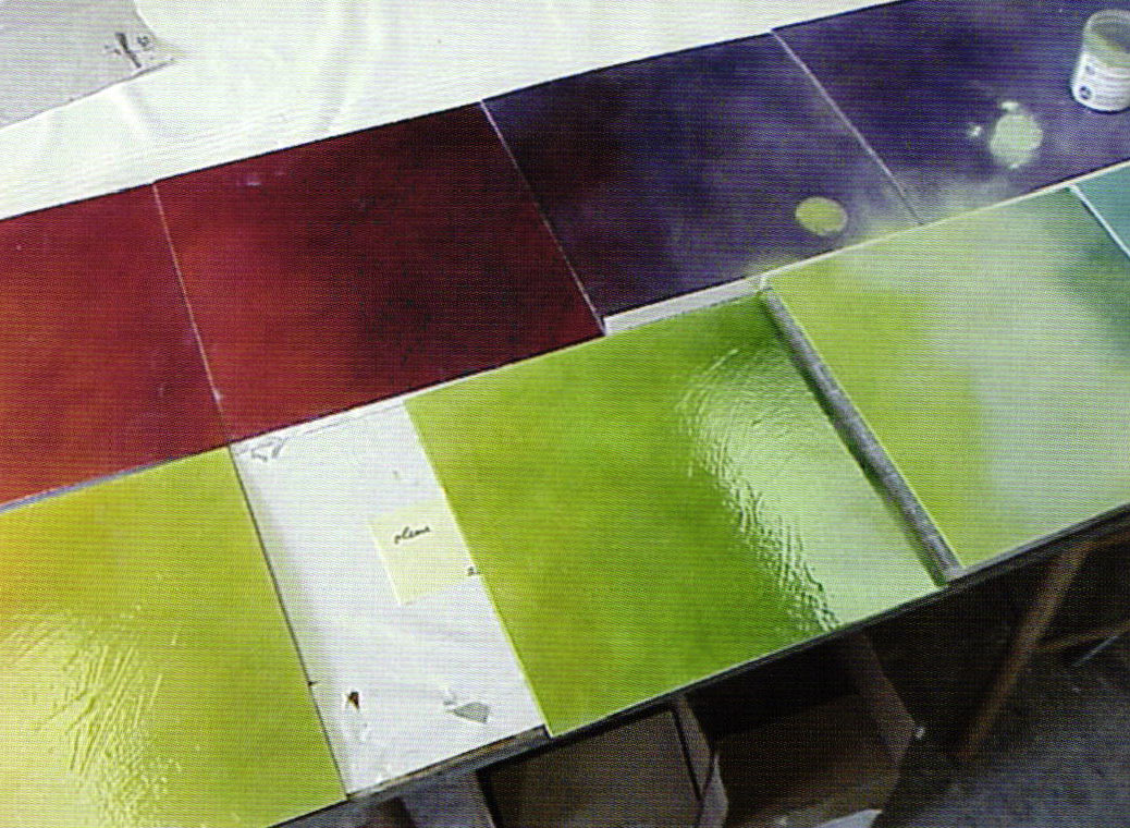 I am offered the large room in the old building. Natural light flows from the glass wall on my left. For inspiration, I situate myself facing the large wall display of colors. Every sample of opaque and transparent color currently manufactured by the company to date is facing me numbering one hundred and sixty nine colors. I become a nest- feathering bird, preparing the work area with eagerness and pleasure. Tools, drawings and supplies, everything is placed within reach. Due to Thompson's abundant supplies there is a sifter for each color. That smallish fact alone contributes to an over-all sentiment of abundance, peace, expectation, and a rising intimation of success.