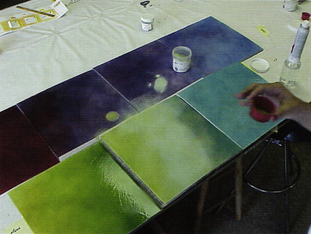 In preparation for the first firing I lay the pre-coated steel panels side by side on the largest table. A smaller table will be used for holding and sifting the pigments. I mean to lay down the base coats in one continuous action on the supporting panels. The intent is to support the narrative panels with a free-flowing ribbon of color applied as in one gesture from beginning to end of the series, ignoring edges between panels.