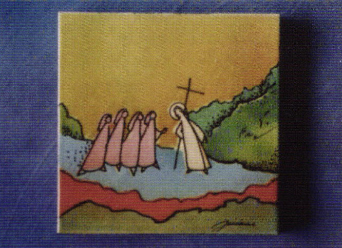 The medium was to be enamel, glass fused onto metal. The story to cover the period of Christ's progression from condemnation in Jerusalem to his death in the place of skulls, Golgotha. This event has been sculpted, written, drawn and painted in different styles by a variety of individuals and from different points of view for two thousand years. I therefore saw my goal to interpret this story visually, in a contemporary style, for a fast growing, vibrant and youthful parish as an immense responsibility.