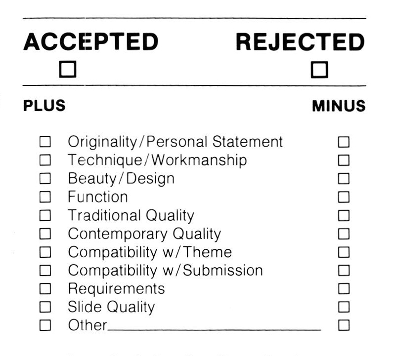 Offered below is a sample form designed by a group of outsiders—businessmen—after witnessing the jurying process of a major craft show. The form is meant to contain the absolute minimum information necessary to evaluate and inform. Its use presupposes a beautifully designed entry form outlining the show's purpose, criteria, size and space limitations. The items apply to both rejection and acceptance. If "Rejected," "Beauty" and "Function" are checked, one can assume that the bracelet, while lovely, didn't seem to fit a normal wrist. Positive marks under "Technique" and "Traditional" would let the entrant know what aspects of the work impressed at least one judge. I think people would be willing to pay a dollar or two more in entry fees for access to this type of information.