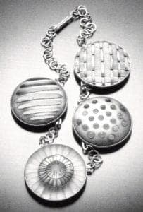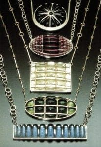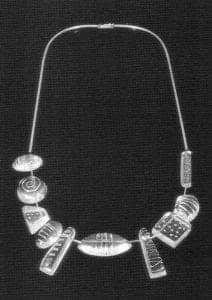 The shapes are very dimensional. In a 1993 necklace each of the five sushi-like beads could be described as glass banded with silver, but each one is different. In several the glass is held by thin wires crossing the form or containing it in a grid. In others the glass oozes from slender slits in the metal.