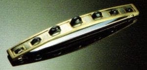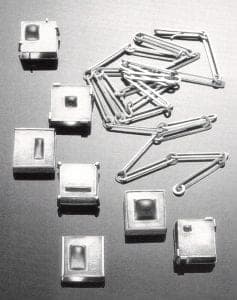 With the inlaid works, Mihalisin also began to offer the wearer a chance to participate more actively. In a necklace of seven darkened silver squares, each with a rectangle or square of glass bulging through an opening outlined in gold, the individual parts can be arranged in any sequence, adding or subtracting them as the wearer wishes. They can also be worn as brooches. This adds a gamelike quality to the rather austere but elegant components and helps to emphasize Mihalisin's preoccupation with permutation. The openings for the glass vary in shape, size, and location on the square. Banding the squares are borders of gold-sometimes completely surrounding the square, at other times stopping short. This piece brings to mind the Minimalist painter Robert Ryman. His career has been based on a series of square white paintings of different sized, media, and surface texture (smooth or distinctly brushed), fastened to the wall with a variety of metal or tape attachments. He has reduced painting to its basics - (non)color, support, hanging device - and created a compelling body of work. Mihalisin employs a similar strategy.