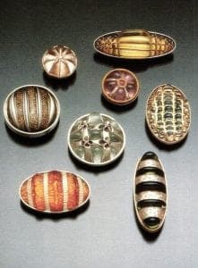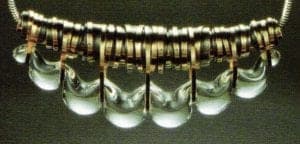 The droop series clearly articulated Mihalisin's concern with process and took the form of very wearable sculpture. In the next series, Mihalisin explored a common jewelry format: the bead. Mihalisin defines bead as an object that can be strung on a chain. Silver or gold was draped in investment molds and glass was slumped into the metal form with an opening for the chain.