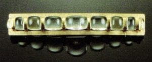 But just as glass has never been just glass in Mihalisin's mind, her jewelry is not just jewelry. That doesn't mean that she makes unwearable sculptural statements. On the contrary, she is extremely aware of practical considerations, including the weight and fragility of her chosen material. She is also concerned with formal sculptural issues. She originally chose to work with glass and metal because of their complementary qualities, the transparency of the glass playing off the opacity of the metal. "Glass slumped around metal is such a wonderful juxtaposition of two unique materials," Mihalisin explains. "Metal is so structural; so manmade; so geometric; although it doesn't have to be; very cold and mechanical. Glass is warm; it's human; it's organic." Yet glass and metal also share many characteristics; glass is even referred to as a metal in its molten state.