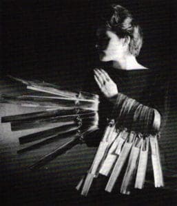Chan has said, "My artistic investigation began with an attempt to understand space; not as a void but as a visual field. Through the process of using materials I began to observe the perception of space. It is perception that determines space. And perception is affected by the presence of forms and materials." This philosophy is most apparent in Between the Lights, 1985. In this piece, palm leaves have been attached to a cotton core to form two cuffs for the arms. The leaves radiate and animate the surrounding space. Bursts of bright primary color have been painted on one surface, offering an interesting play of light and shadow when the piece is worn.