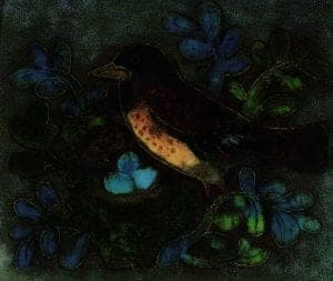 Enameling suited Karl Drerup both artistically and practically. In his words, enamels have "color, intimacy, tell a story in a small space and need little workshop space". The characteristic small-scale, jewel-like color and meticulous craftsmanship of Karl Drerup's enameled plaques, dishes and bowls reflect his viewpoint. Like portrait miniatures or jewelry these small enamels are intimate objects to be lived with, handled and examined at close range. In large part, Drerup's imagery reflects the people and the natural world around him in places he lived, whether in the Canary Islands or in New Hampshire. Some imagery is drawn from traditional Christian iconography and some from childhood memories. Other images are non-objective. In early works like Robin with Three Egg in a Nest (approx. 7″ x 7″), a single bird and nest, two fish or a simple still-life might appear within a small round or rectangular format. By the mid-forties, these images became more complex both in imagery and composition. Birds with Fox (10⅝" x 10⅝") c. 1950 portrays the plentiful and exuberant life of a marsh. Horizontal ribbons of luminous sky-blue water alternate with strips of earth in a densely occupied but compressed space while the viewer is directly engaged by the quiet gaze of the wildlife. Within this small space, Drerup achieves color, intimacy, and drama.
