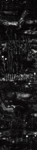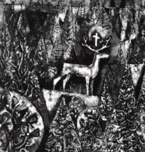 In the mid-fifties, Drerup produced a number of larger works by combining three enameled plaques either horizontally or vertically. The three-part vertically arranged Scarecrow (35½" x 13½") continues the abstracted natural forms of the earlier works. It was exhibited and awarded a prize in 1956 at the Nineteenth Ceramics National in Syracuse and shown in American Artist in the January 1957 issue. When Drerup arranged the three parts of his Saint Hubert horizontally, he adopted the triptych format traditionally used with religious imagery to tell the story of the medieval Christian saint's conversion during the course of a stag hunt. Drerup eschews medieval attire and stylistic devices, preferring a more timeless landscape as a stage for a contemporary drama of spiritual revelation. Drerup fashioned a number of large wall crucifixes during this period. Throughout his career as an enamelist, the familiar Christian image of St. George and the Dragon remained one of the artist's favorite subjects.