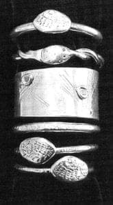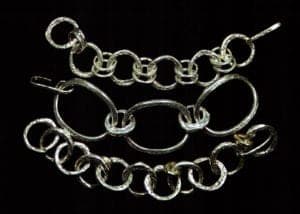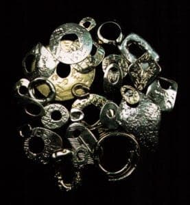 O'Rourke says that the years after 1982 of coming to grips with some difficult times in her past marked her transition to becoming a serious jeweler when she began her first experimentations with steel. The first were ring sets with steel backs, and bracelets with steel and silver overlay. Texture became all important. She would use the Navajo stamps to create and visually complex surface designs while she explored the notion of wearable architecture in combined groupings.