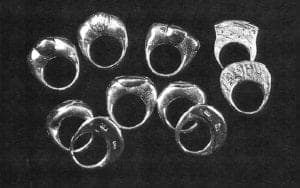 By the late 1970s O'Rourke had added rings to her line and was making Koros, which is her name for the pendants grouped together and worn on cords. These biomorphic forms were hand-fabricated from silver, copper, and brass. Old Navajo stamps became another inspiration and tool for O'Rourke. The stamps which have symbols from Navajo cosmology are used to create gridded designs directing both the form and the iconography of the pieces. Today the stamps are always near her hand at the workbench.