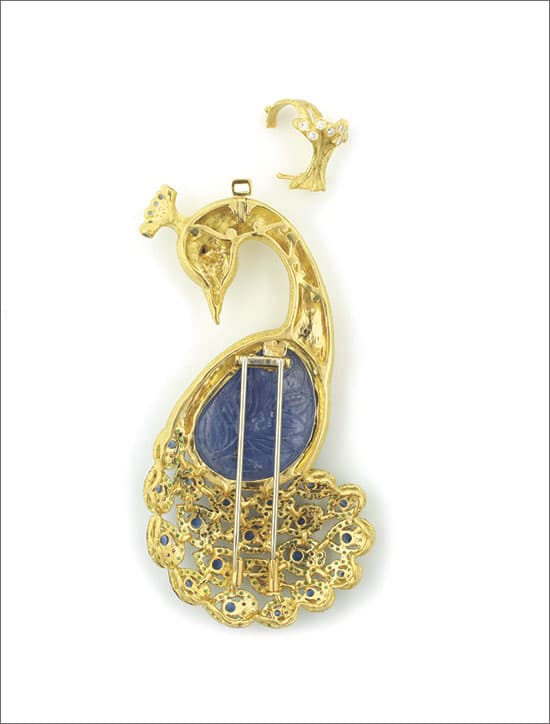 One February at the Tucson gem shows, inspiration took flight for Katy Briscoe of Katy Briscoe Inc. in Houston. "I remember opening a paper with this carved blue sapphire and as soon as I saw the stone I said, 'You're a peacock,'" she recalls. "I couldn't buy it at that point, but I wished I could, and I thought about that stone for a very long time." Subsequently, anytime Briscoe saw an image of a peacock, the sapphire came to mind. A few months later she was able to purchase the gem and immediately started sketching an 18k yellow gold pin/pendant peacock around the 83.6 carat sapphire, incorporating faceted blue sapphires, diamonds, and tsavorite garnets. She did much research online to ensure she could accurately depict the bird and determine the best use for the large sapphire. "The body of a peacock was about the shape of the sapphire," she says.