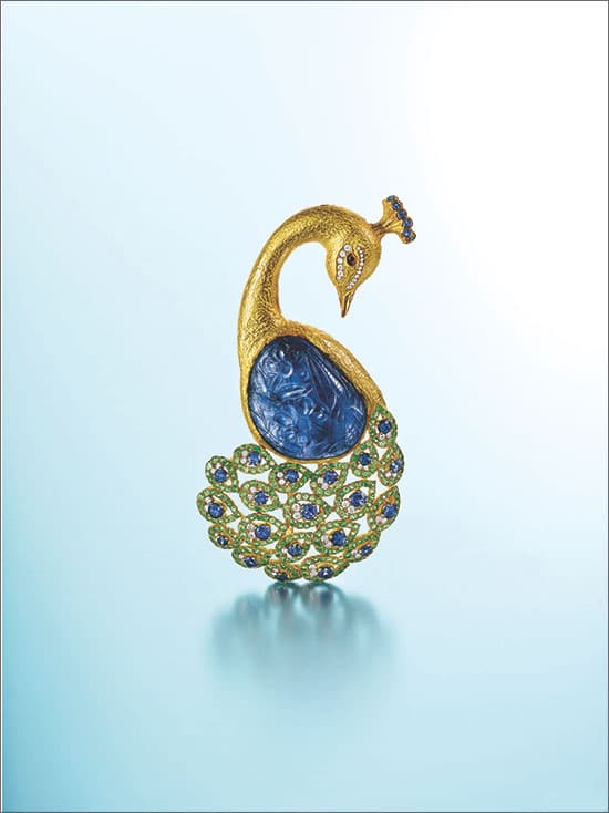 One February at the Tucson gem shows, inspiration took flight for Katy Briscoe of Katy Briscoe Inc. in Houston. "I remember opening a paper with this carved blue sapphire and as soon as I saw the stone I said, 'You're a peacock,'" she recalls. "I couldn't buy it at that point, but I wished I could, and I thought about that stone for a very long time." Subsequently, anytime Briscoe saw an image of a peacock, the sapphire came to mind.
