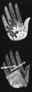 In this manner, the human hand became the foundation of Kiff's most ambitious series to date: the Hands of the Heroes. Over a three year period, Kiff made more than fifty hands, honoring such diverse personalities as Satchel Paige, Buddha, Emily Dickinson, Don Quixote, Roald Amundsen, Nelson Mandela, Jacques Cousteau, Leonardo da Vinci, Sigmund Freud, Annie Oakley, and Colette. Images and objects referencing the essence of each individual were fabricated and collaged together on identical, oxidized sterling templates: a commemorative tradition established by Kiff ten years earlier and a narrative tradition defined succinctly by Lloyd Herman as "storytelling… by reducing stories to symbols with strong, but often personal associations."