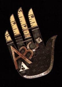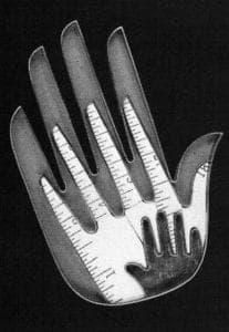In 1991, Kiff combined the hand with another favorite object, the ruler, in a series of ten pins entitled Measuring Up, commissioned by the Washington State Arts Commission to be exhibited in public schools throughout the state, notably, alongside paintings, sculptures, prints and photographs by nine other artists selected from a nationwide search. Kiff chose the hand because the image is well-suited to children both visually and metaphorically; she added rulers, numbers and pieces of slate - common classroom materials with which children are well acquainted. She made five pairs of hands focusing on five different sets of standards by which students are measured: those determined by themselves, parents, friends, school and the world at large. This series is an excellent example often brooches which are enhanced when exhibited as a group, but they are also designed to make complete individual statements.