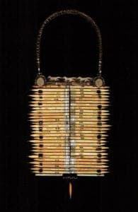 One of the best examples of this can be found in Sticks, Stones and Words, a breastplate modeled after 19th century Sioux Indian armor made from bird bones. Kiff has created her own politically-tinged, poetically-loaded version of this antique frontispiece from old wooden pencils in a necklace. The yellow paint of all the pencils has been fled off, except for the names of the manufacturers: Supreme, Save, Choice, American, Master, Preferred, Balance, Colonel, USA Federal and Blackfeet. The pencil, worn to a stub, dangling from the bottom center was made by the Union pencil company. The shaved pencils raise the question, "Who scalped whom?" Four tiny, pastel-pink erasers are bezel set at the top of the breastplate, just below the silhouette of three galloping horses. The Plain Indians wore bones across their chests as a symbolic form of armor; Kiff's breast plate of pencils suggests the power of the written word, of writing as a form of protection, a means of establishing order and communicating. In the context of the U.S. government and the Plains Indians, one might think of broken treaties, and the efforts to erase native Americans and their culture from North America.