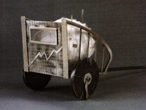 Transport, made in 1990 for the Artworks for AIDS exhibit in Seattle, is both intellectually and emotionally one of Kiff's most engaging works. The miniature, two wheeled silver cart alludes to the personal trauma of mortal illness and the historical countenance of mass deaths. Such carts have been used in cities throughout the ages to remove victims of epidemics; "there is an implied connection between old and new plagues - with specific reference to AIDS."