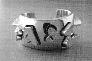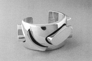 So far all the bracelets have been fabricated out of sheet. He has rarely cast any forms, although he is beginning to incorporate cast shapes into the jewelry. The finishes he has applied have alternated between three types: a high shine, a matte finish, and a tumbled finish. More recently, he has begun masking certain areas of a piece to combine finishes to achieve a more elaborate surface treatment.