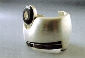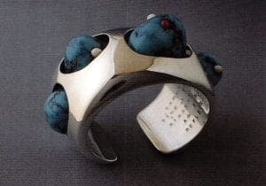 Loloma, a Hopi who had studied at Alfred University and worked for years as a ceramist and teaching pottery at the Institute of American Indian Arts in Santa Fe, was among the first to apply an elaborate mixed materials inlay to traditional forms of Hopi silversmithing. Using components such as wood and ivory and abutting them into spacious tracts, Loloma constructed a tactile and dynamic plane on both the inside and the outside of his pieces. The public face and the private interior of the jewelry were in constant interplay.