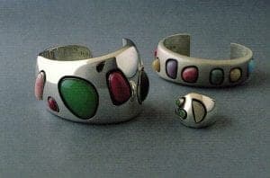 In jewelry, Navajo craftsmen Victor Beck and Kenneth Begay were especially successful at achieving modern space in design. The concept of forms animated by mobility, yet demonstrating allegiance to traditional methods of construction, marked a turning point in Rawdin's evolution. He now believes that both Loloma and he extended learned techniques in a similar fashion: "blowing out the shapes;" applying to the forms a probing exploration of surface to incorporate negative space; protrusions; and broad yet compact spans of inlay upon the jewelry.