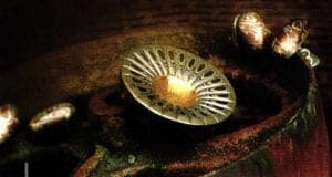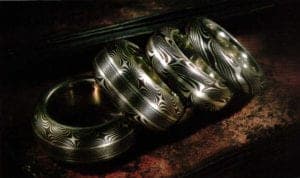 Mokumé Gane is a technique with origins in medieval Japan. The natural reproduction of wood grain was the founding idea of this extremely elaborate art of metalworking. Between 25 and 97 metal made of gold, silver, copper, palladium or its alloys are exposed to heat pressure and worked into a block. Twisting and turning the metal layers as they are forged produces the artistic patterns. In view of the fact that the heat is significantly lower than the welding temperature, a welding diffusion of the metals takes place on the surface. Klaus Loose became enthusiastic about this metalworking art very early on, when it was still entirely unknown in Germany. He taught himself this Far Eastern art. The plates are the basis for Mokumé, with which Klaus Loose then manufactures jewelry and equipment in the standard manner. "It takes a long time to make Mokumé sheets like this; depending on the number of layers and size of the sheets, you need a lot of hours for hammering. Naturally, I could make my life easier and use prefab Mokumé sheets, which are now available. But that is not my philosophy. After all, the smith work is part of the artwork. You can control the patterns up to a certain degree, but every piece is unique, as there are always deviations", says Klaus Loose enthusiastically.