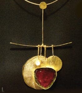 Pendant, 1968, gold, tourmaline disc, moonstone