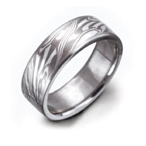 And I'm not the only goldsmith gathering inspiration from knife makers. Andrew Nyce of Andrew Nyce Designs in Cape Elizabeth, Maine, is also adapting techniques from knife makers for use in his mokume and patterned stainless rings. Several years ago he and I journeyed to Taylor's forge/workshop near Miles City, Montana, and observed the Montana Boys in action. Andrew has recently incorporated a new mosaic mokume pattern (7) informed by an arrangement used by Mike Norris, a noted Damascus knife maker and Damascus steel maker. He has also been intrigued by the possibility of making stainless steel/gold mokum?. After a couple of failed trials, he got the 316L stainless steel and platinum-enhanced sterling alloys to bond (8). Encouraged by this success, he is now working on 316L stainless steel and yellow gold mokume.