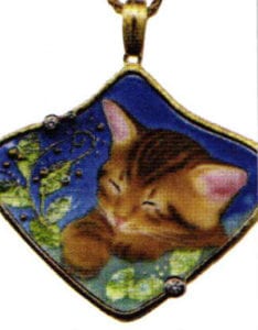 I don't use the technique of cloisonné enamel. After glazing with transparent or half transparent glaze and firing the work, I decorate the work with fine pieces of gold foil or platinum foil and finally I paint minutely the fur of the animal with non-transparent glaze of minute particle. Moreover, I design both sides (front and back) of the work so that customers can enjoy the work more.