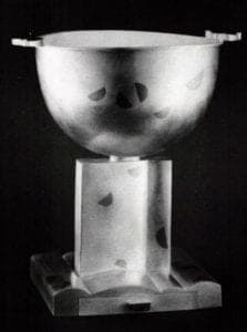 In fabricated pieces, all soldering must be completed before beginning the Kum-Boo process. When the piece is fully assembled (except, of course, for elements to be attached with rivets or similar cold connections), the work is cleaned thoroughly in fresh pickle. In order to establish a skin of fine silver, the work is heated again until it shows brown spots, then it is again dipped in the acidic pickle. The piece is rinsed in water and lightly scratchbrushed. This cycle is repeated from three to six times, or until the metal retains its white color even when heated. The work is then dried carefully, with care taken that the delicate skin is not touched.