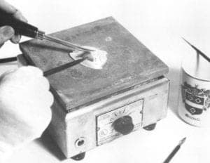 When dry, set the object on the hotplate, turn the heat to High, and selectively burnish areas of each piece to tack down a couple of spots on each pattern piece. Turn the temperature to Medium and burnish each piece fully. Remember to cool the burnisher periodically. When burnishing is complete, allow the piece to cool, then examine each edge for bonding. If the diffusion was complete, set the object in hot pickle. - For a large object the hotplate might not provide sufficient heat. Diffusion will not occur if the parent metal is not hot enough. In this case glue the overlay pieces with the gum tragacanth mixture as described in B (above). A torch can be used in conjunction with the hotplate. Obviously this process will be easier if you can enlist the aid of a friend.