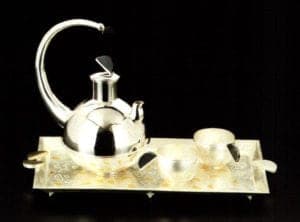 Many Korean silver utensils are decorated with 24-karat gold overlays in the form of letters and patterns that convey wishes for good health, wealth and longevity. In most cases the ornament is set in the interior of a cup or bowl, or within the bowl of a spoon, so that the food will come in contact with the gold and therefore be able to assimilate its positive characteristics before being ingested.