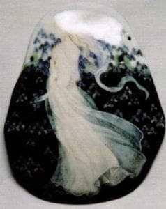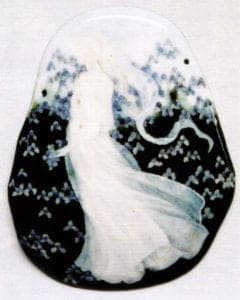 The sky was inlaid with a hard opaque white, then painted a sheer blue glaze, as were some iris, then fired. Gold foil was inlaid for a different shade of iris, fired, then overlaid with opal white to be painted later with overglaze colors. The figure was built in inlay of opaque cream for the solid center portion and flux for the sheer dress portions; this was overlaid with layers of opal grisaille. The 'soil' was built up with transparent browns and flux over fire scale in a number of firings. The veil was partially inlaid with opaque white and transparent green, then completed with grisaille, white opal, and painting. All the parts were brought to the same level, stoned, and re-fired. The complicated part was finding colors that would be compatible and could be sustained for all the stages. There were three different white opals of different meshes used for their different degrees of transparency. The final stages were layers of painting with overglaze colors and an opaque grisaille painting white to create the detail of the figure and iris. The plaque was fired between 30 and 35 times.