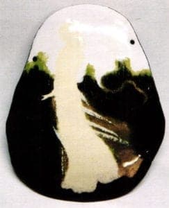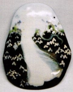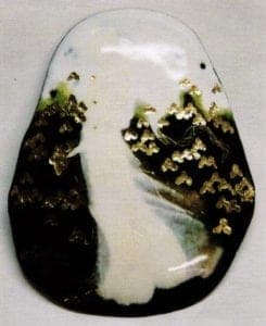 When I did the painting technique plaque, I hit a snag. I painted a portrait in gorgeous living color, fired it, and as it cooled, watched a black and white image emerge. It frustrated and intrigued me. The result of this challenge was my graduation project, the 'panorama' necklace (see GoM Vol. 10, No. 5, pg. 244). The initial idea was for an inverse panorama that gave a 360 degree view of a miniature world without end. It was a composition of light and dark areas, of near detail and far away spaces. With the design done, I had to learn which colors would keep true through the firing, how to manage the colors to get even glazes and sharp detail. AII the plaques were painted together as a continuous unit, and then fired once in the end. It took me nearly six months to complete this project.