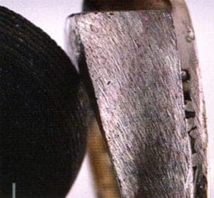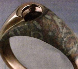After burnishing, the ring should look like in Fig. 7. The better the ring is burnished at this step the less pits will be encountered after the ring is filed smooth. In the sample there were only six pits on the whole ring after burnishing. There is no rule in how to smooth out the lasered area. It can be filed, ground or sanded. Nine separating disks could be sticked on a flex shaft mandrel like pictured and could smooth the whole area in just a few minutes with very little waste (Fig. 8). In Fig. 9 the whole lasered area is shown ready to have a lighter grit rubber abrasive wheel finish applied. This is the last step before sand blasting and the defined patterns can already be seen, emerging in the lasered section. Then it is time to sand blast the ring to make the pattern show up. The solid area gets polished. After polishing this area should be masked of before sandblasting. The Mokume Gane section gets sand blasted and the Laser Mokume Gane section is inspected. Fig. 11 is a close up of the Laser Mokume Gane veining of the finished ring. The ring is all 14 karat with rose, yellow and green gold inlayed into the white section. In Fig. 12 the ring is ready to be set with a stone. The whole process of Laser Mokume Gane can be also done on metal sheet. Then the bur should not bur more than half way through the sheet. After lasering, the sheet should be rolled through a rolling mill. This helps to save waste.