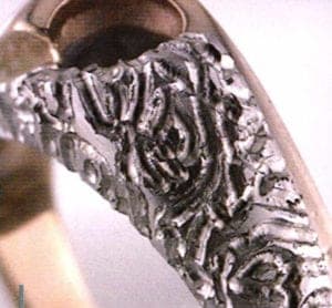 The traditional Mokume process yields very beautiful results but is extremely labor intensive. Along with the high prize of labor is the large amount of waste. The shape of the finished product is also restricted to the limits of the ancient process, no cast pieces. It was possible to find a way to transform almost any finished piece that is cast, hand fabricated or even a wax model to create a custom Mokume Gane piece.