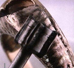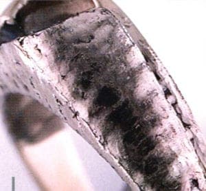 The section for transformation should be picked then. For marking the pattern a extra fine tipped permanent marker works well (Fig. 2). To be creative the traditional wood grain pattern can be duplicated or any variation as well as letters, numbers and symbols. It is also possible to draw on a wax model. Then a sharp tip carver can be used to scrap in the pattern about 0.75 mm deep. Then the ring is cast like normal and the process is being continued with filling the veins (Fig. 5). The size of the veining can be all one thickness or vary in size. Ball burs in sizes from 0.5 to 0.9 mm seem to work best. The ball bur should be dripped in oil and drawn across the line which is ground out or the whole line can be covered with a fine layer of oil (Fig. 3). It is best to use different size ball burs to make the pattern more random. The entire section is ball burred with a depth of at least 0,75 mm deep on each vein. When the burring is done the ring will look like a casters worst nightmare (Fig. 4). Then the fun begins.