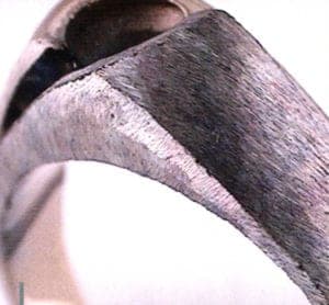 Multiple colors can be done in a single vein. It's best to use a beam width about the diameter of the vein and filling it with a 0,25 mm wire or 32 mm wire. One can work at 10 hz to speed the job up. After the whole ring is filled, the beam width should be opened up to about 1 ½ times the width of the veins and the power should be ramped up to smooth out all the veins to help remove pits. This also helps to save time on burnishing. A rotary burnisher (Fig. 6) that is fairly aggressive is used for burnishing at high speed until the surface is almost glossy.