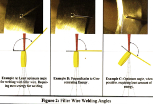The acute angle of Example A's wire also has a tendency to reflect the laser away from the intended weld spot. Example B's wire angle makes the wire feed rate easier to control. B allows the smallest bits of wire volume, as well as consistent lengths of wire, to be nibbled off by the beam at the operators will. However, even if B's feed rate is controlled to melt only a fractional length of wire, B still requires the laser energy to melt through the wires entire diameter before fusing into the piece. B's wire angle, although not as extreme as A's, can also have a tendency to reflect the laser light away from the weld spot. The optimum angle is shown in Example C because, just like B, the feed rate is easy to control, and the focal point of the laser beam is able to nibble off a very small piece of the wires face rather than having to pass through the entire girth of the wires diameter.