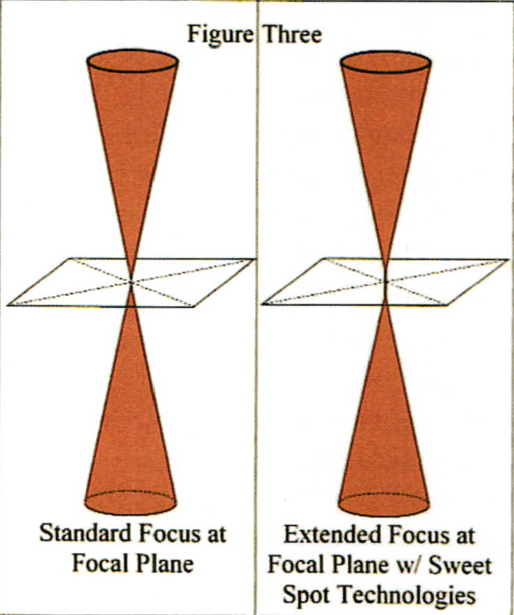 Sweet Spot Technologies that are available, as options, in some lasers, as shown in Figure 3, provide a finer focused beam over the focal plane. The diameter of the beam stays consistent for a distance above, through and below the focal plane. The physical force of the laser beam straightens out and enters the metal as a good Olympic high diver would enter the water: very straight and uniform, causing no splashing, and minimal turbulence. This effect allows the operator greater ease in creating uniformed, overlapping weld spots throughout the bead at lower total energy. This provides consistent energy distribution, and concentration for a nominal distance above and below the focal plane, giving the operator an area of grace to move the piece by hand and keep consistent results, regardless of slight movement above or below the focal plane. The energy concentration in the physical outline of the focused beam is better described in my last article.