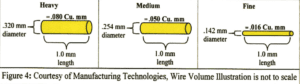 When thinking of the laser's energy requirements in connection with filler wire, consider that the beam must have enough energy to melt through a section of filler wire into the piece. The more mass, or volume, of wire that the beam must melt through, the more energy will be required. Wire volume being melted, can be controlled by wire feed rate as discussed earlier in this article, but it can be further controlled by the diameter of wire being used. Each diameter used has its function depending on the job at hand. Figure 4 shows examples of commonly used filler wire diameters with the volume of a 1 mm length of each wire diameter. The smaller diameter wires allow lower energy parameters to be used with greater ease of welding thin materials, or close to small or heat sensitive items with less risk of melting through, or causing damage to these items.