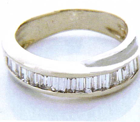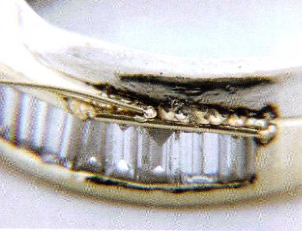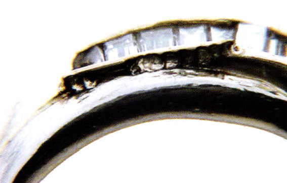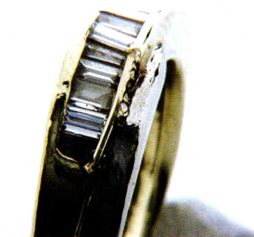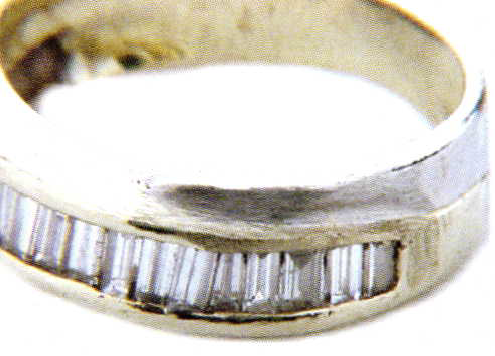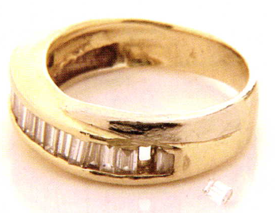 My client sent a two-tone channel set diamond band to me so that I could replace the missing baguette diamond and repair the worn channel. This laser welding project is that repair.