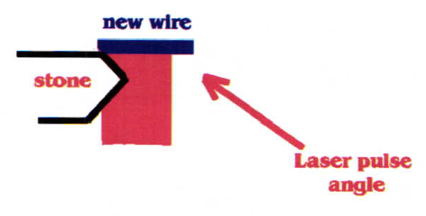 With the replacement stone in the channel, I then proceeded to lay the flattened 20 gauge wire in place and set my laser to tack the wire in place. This 'tack' allows me to check for proper stone seating and alignment of the new channel wall.