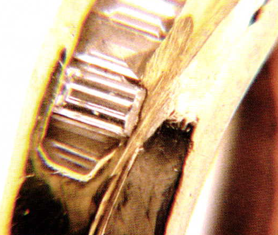 Upon examining the ring, I was able to determine the reason the baguette came out of the channel mounting. The channel wall over the stone was worn down below the girdle of the baguette and the stone simply fell out. After trial fitting the replacement stone, I began to rebuild the channel.