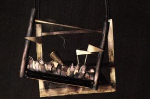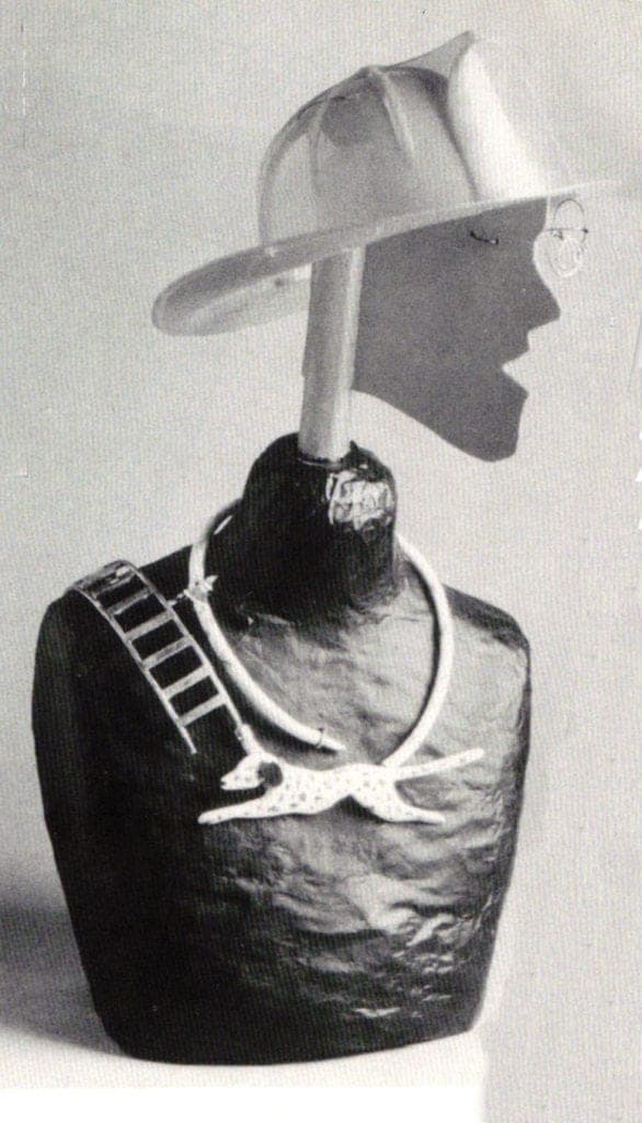 With Help, Help, House on Fire (1984) the subject matter is more situational. The body is truly the armature for this narrative, which is spread out over back and front and shaped in an arch form to go over the shoulder. It was executed with a mannequin. Hall has been fascinated with the American fire house since childhood. This piece shows her ability to draw from diverse materials to fill her need and to not let technique overpower her statement. Even when working with silver her concept has never been restricted by the metal's preciousness.
