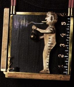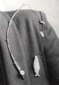 L.H. Bean Pole (1983) is a throwback to her earliest rudimentary efforts in 1970 to make jewelry as important in the back as in the front of the wearer. Formally, the use of the body-as-nature—the body as part of a dramatic adventure—is a major element of the work, as is the delicacy of line. Flirtatiously, Hall invites the spectator to approach what appears to be a contemporary pin and then offers an absorbing Mark Twain-like story.