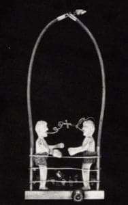 K.O. (1985) continues American sports subject matter involving the idea of participation and movement, either with line or with moving parts. The two "found" figures imply interaction but don't look very mad at each other, which creates an ambiguity with the angry "conversation" seeming to take place between them. Are they shaking hands? What can two boxers do with one glove between them? Hall's work is infused with such mysteries. She says a piece of art without some mystery becomes craft and recognizes any such shortcomings in her own work immediately.