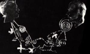 The Conversation (1985), in the form of a chatelaine, as with many of Hall's works, addresses a practical, everyday situation—this a psychologically laden and spirited argument between two Matisse—like male and female heads with symbols involving the question mark, a card game, a kiss, the heart, the number sign and the love birds for satisfaction. Her messages in the "theater" pieces seem at the time literal and symbolic, as well as poetic and practical. The use of charms on chains creates a kind of staged movement. Here Hall makes the usual understood by presenting it in a new and sometimes shocking way. Much of her work has an edge, is usually bold, but never crude. These simple head forms in The Conversation are the basis for a line of pins produced in a limited series.