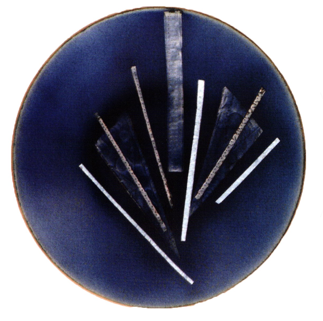 Many of you have done this with metal foils, of course. The difference here is that the metals I have been using are thicker than the foils generally used by enamelists and the techniques are different as well to accommodate the greater thickness of the metal. I use sifting to get the enamel onto the copper and foil and wet inlay for touch-up work. The pieces pictured in this article have been done on 18 gauge copper that was first sifted with enamel and then fired sufficiently to bring the enamel to maturity. The pieces were then counter enameled, and all are done with transparent enamels.