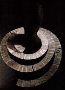 Other photo-jewelry includes a series of circular collars entitled "Queens," each of which is a laminated photograph of a woman's mostly bare shoulders adorned with crown jewels. He made irregular-shaped collars of blown-up photographs of flowers in which the wearer's head, in the center, looks like some eccentric pistil. And he has used many newspaper sports images - of divers, pole vaulters, etc. - usually embellished with precious metal or stones (for example, gold wires outline a diver's rippling hair). This is a different kind of doubleness: Bakker makes the object a kind of oxymoron by combining photographic imagery, a commonplace and disposable element in the 20th-century, with such valuable materials. The photographic jewelry is so different in tone from the profiles and the shadow jewelry that one realizes how impossible it is to pigeonhole Bakker.