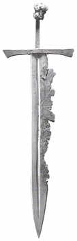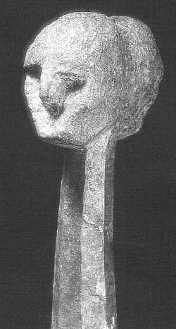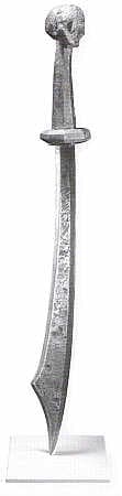 Even in Sauder's somewhat representational pieces, Nature asserts a certain control over the artist's process. A primal presence is evident in a rounded, hammered head atop Nyamakala 13, a highly textured sword displayed upright on its tip; its hollow-eyed stare causes it to appear like a skull- Its other facial features are rugged, almost abstract. They appear rough hewn, a first draft. Acidness eyes, block nose, and angular chin contribute to a primitive appearance, alluding to the possibility that the bead is an ancient artifact. Seemingly mummified by centuries of burial or dulled by primitive practices of fetish worship, does the sword possess magic? The mystery of its age gives the head a somewhat menacing gaze. Should it be tested or is this an instrument of protection? This implied primal state in Sauder's work transports the viewer into the alchemist's realm, and allows one to participate in what seems to be the ritual initiation of a secret society.